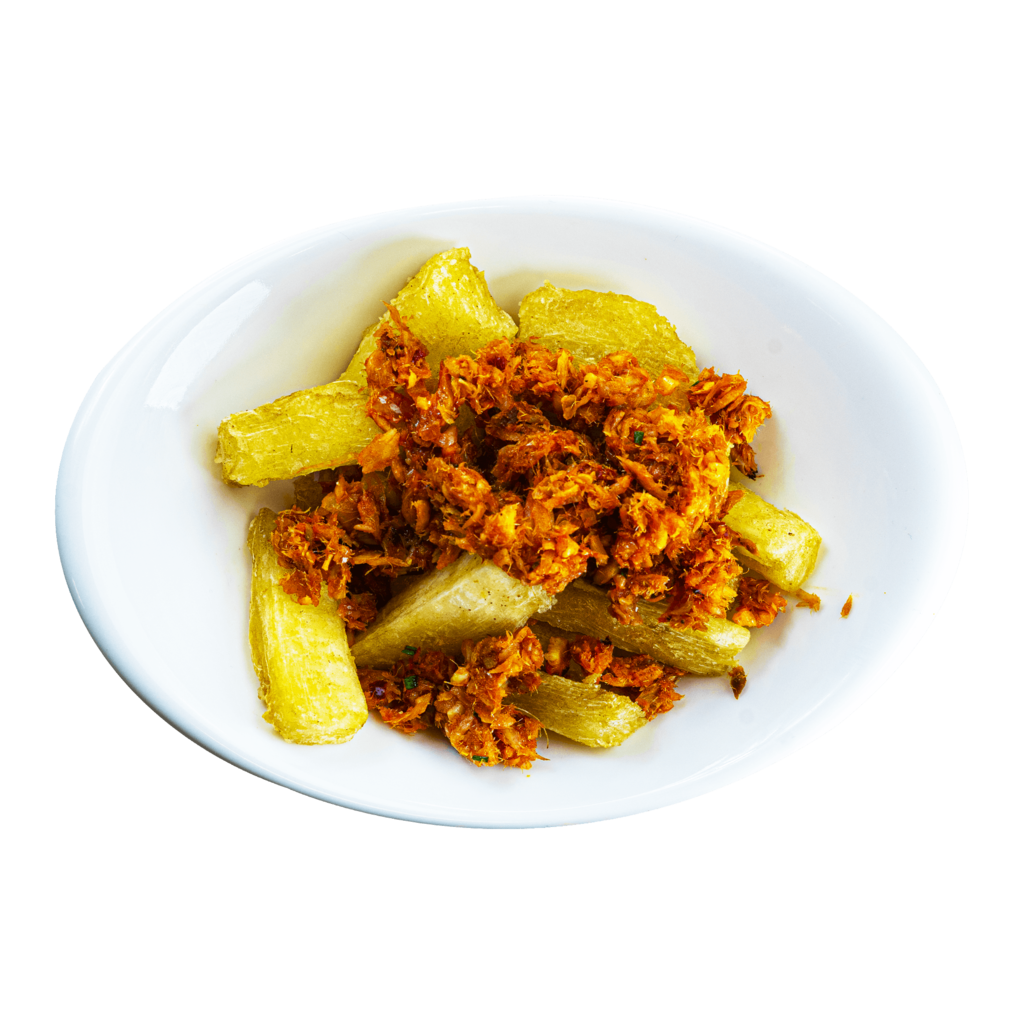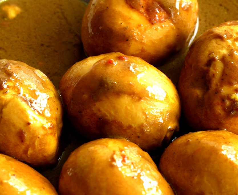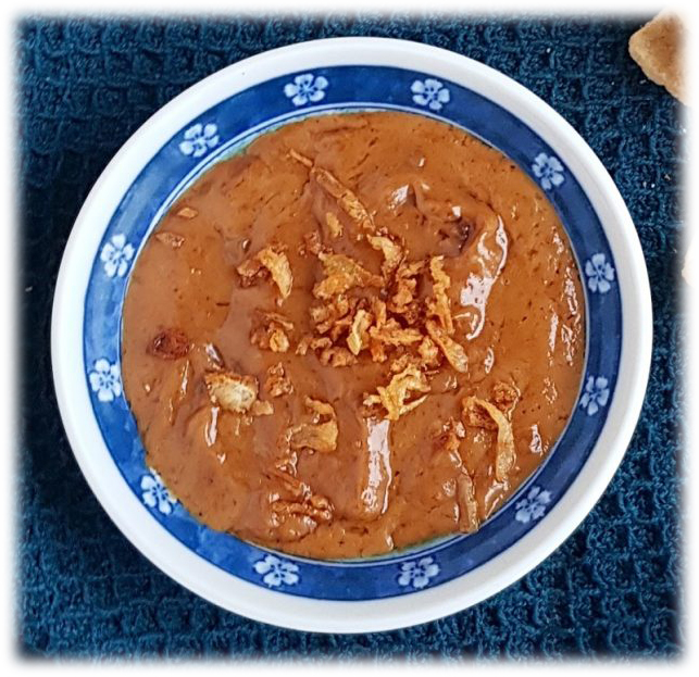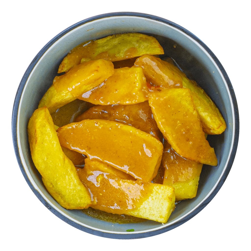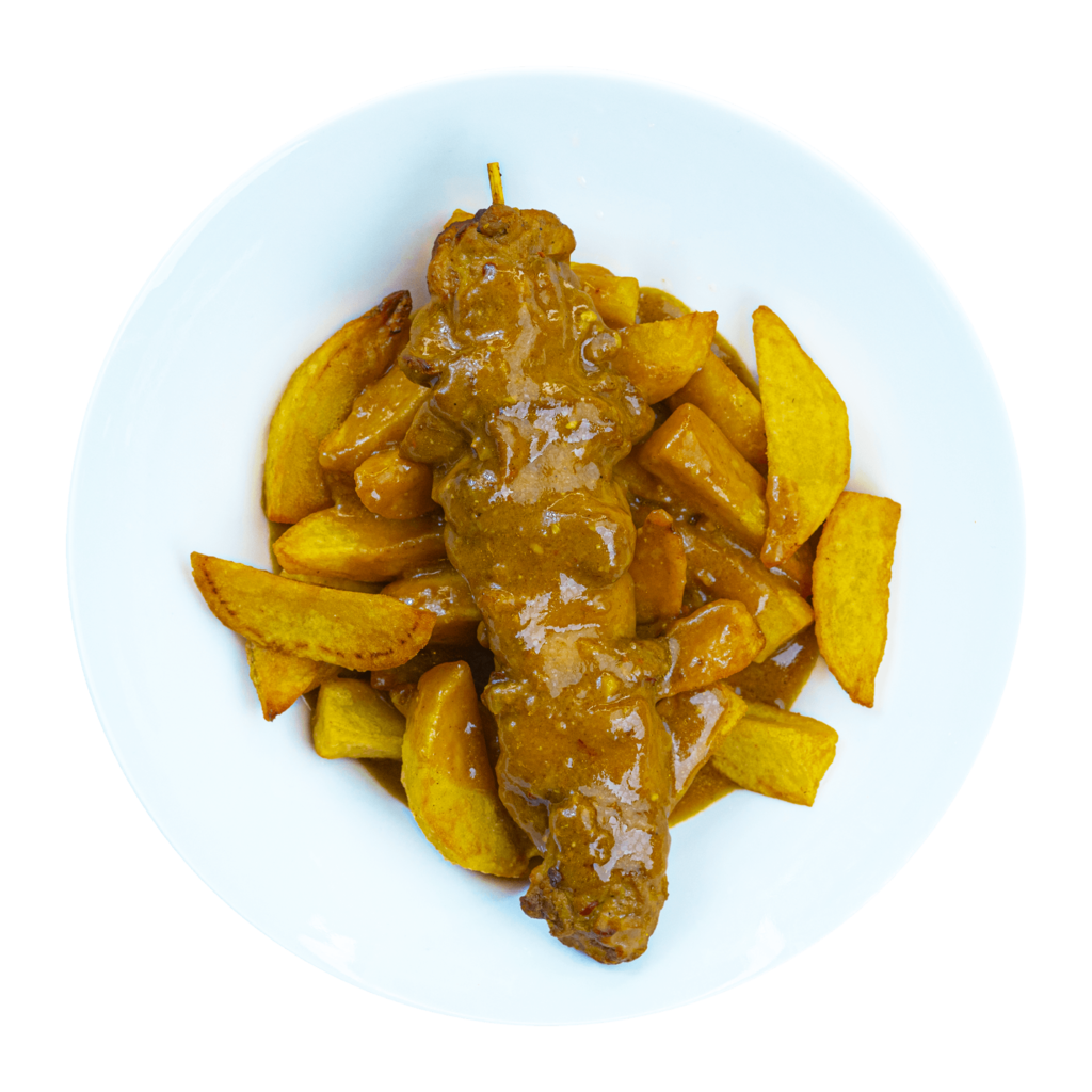 geserveerd met aardappelpartjes in pindajus of mitar-mitar (half aardappel-half nasi)