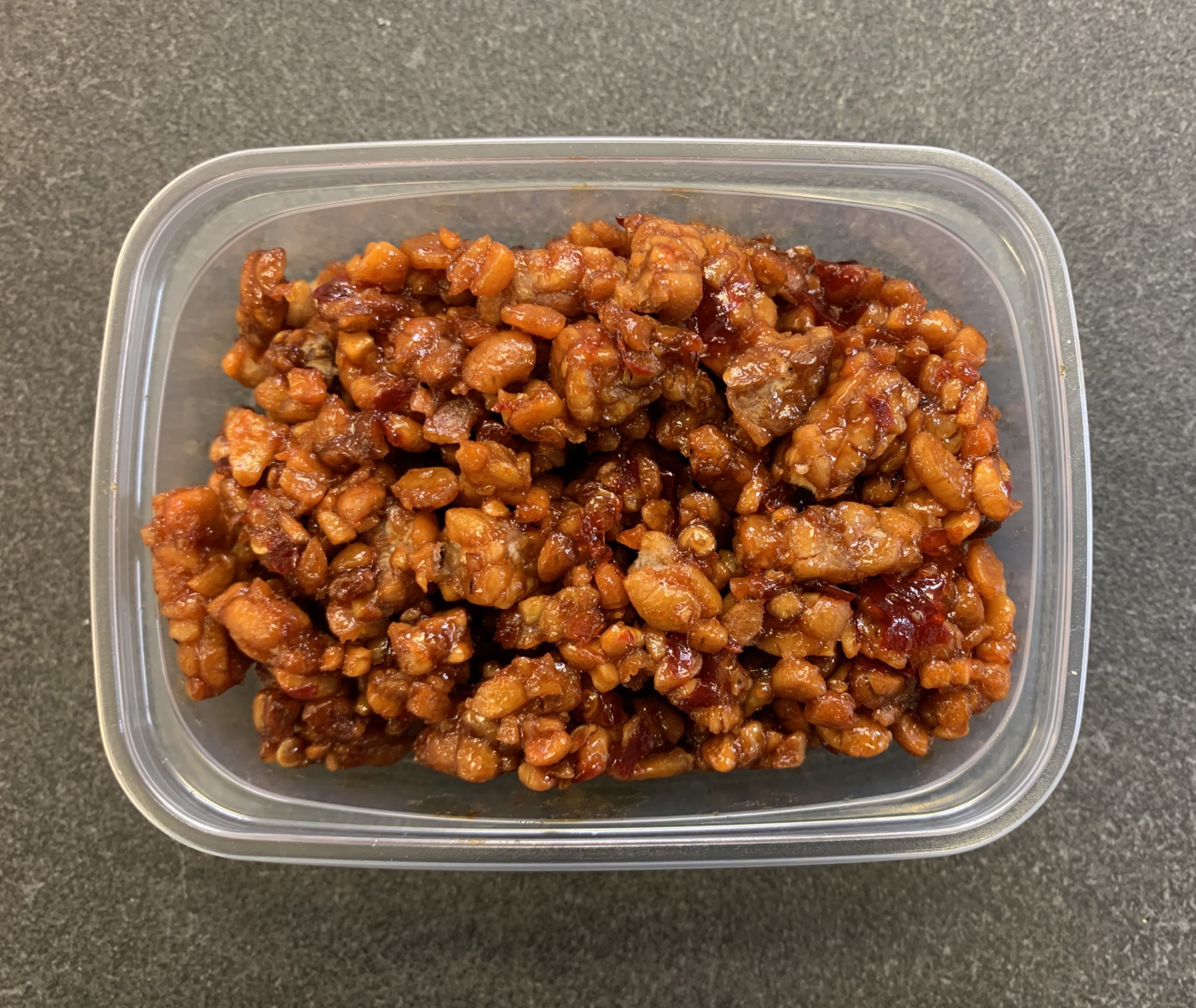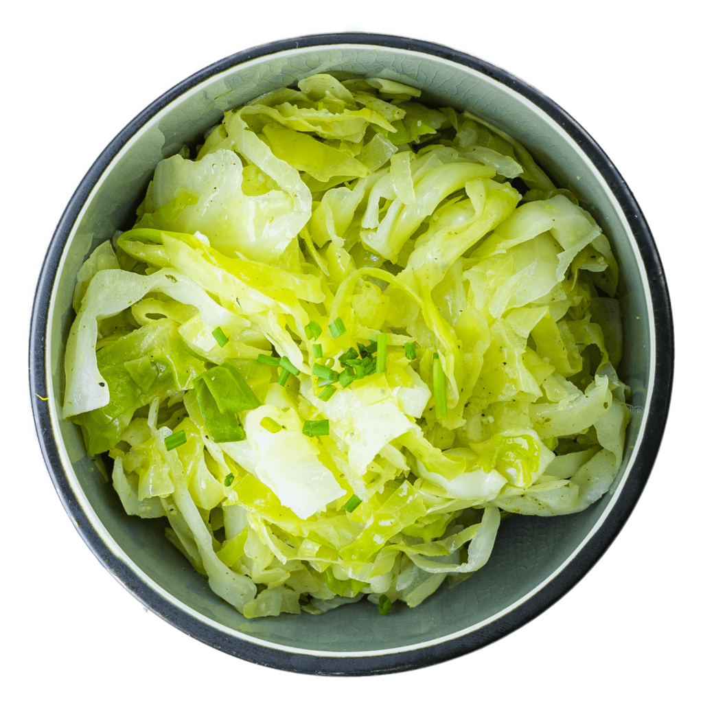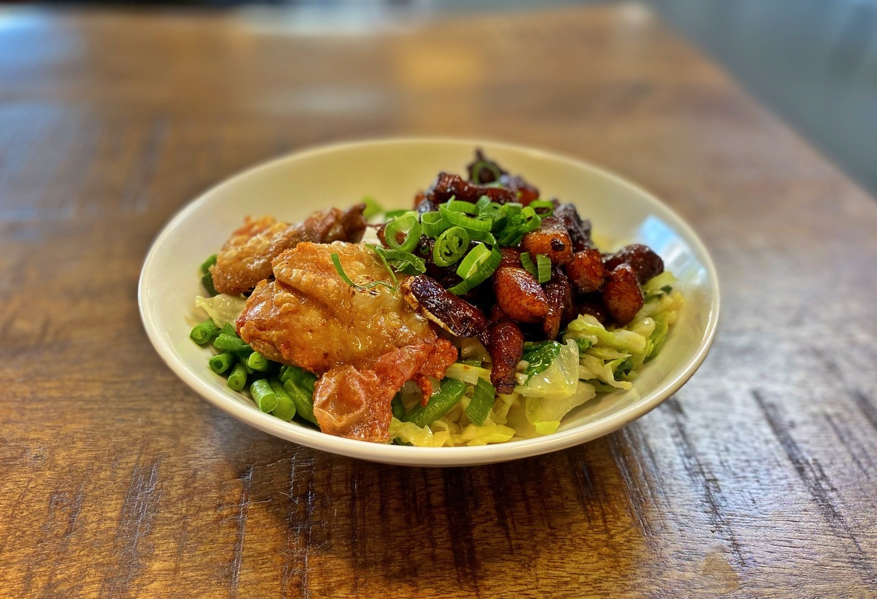 met blokjes spek gesmoord in sojasaus, spitskool, kousenband en gegrilde reepjes kip
