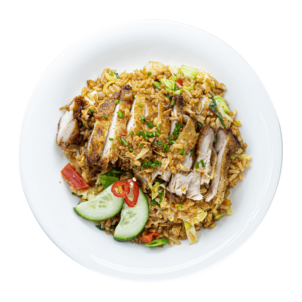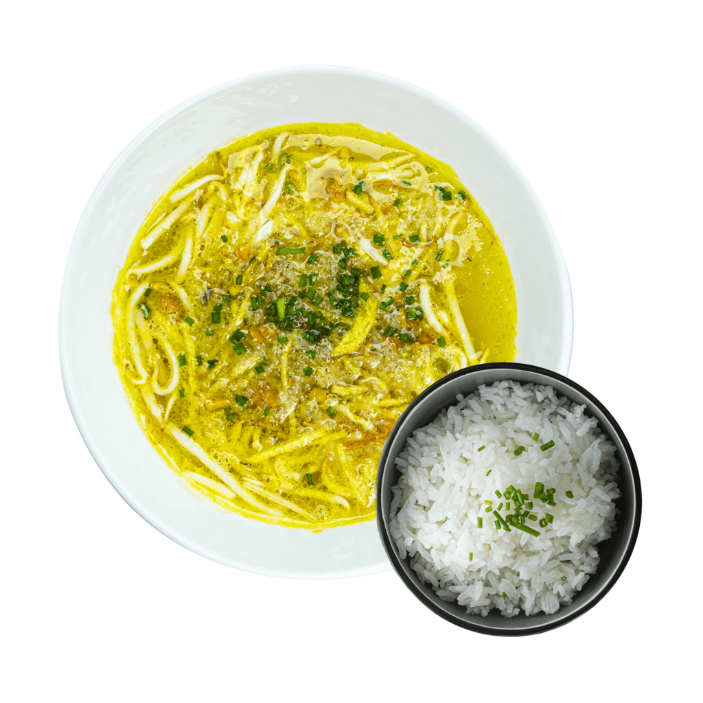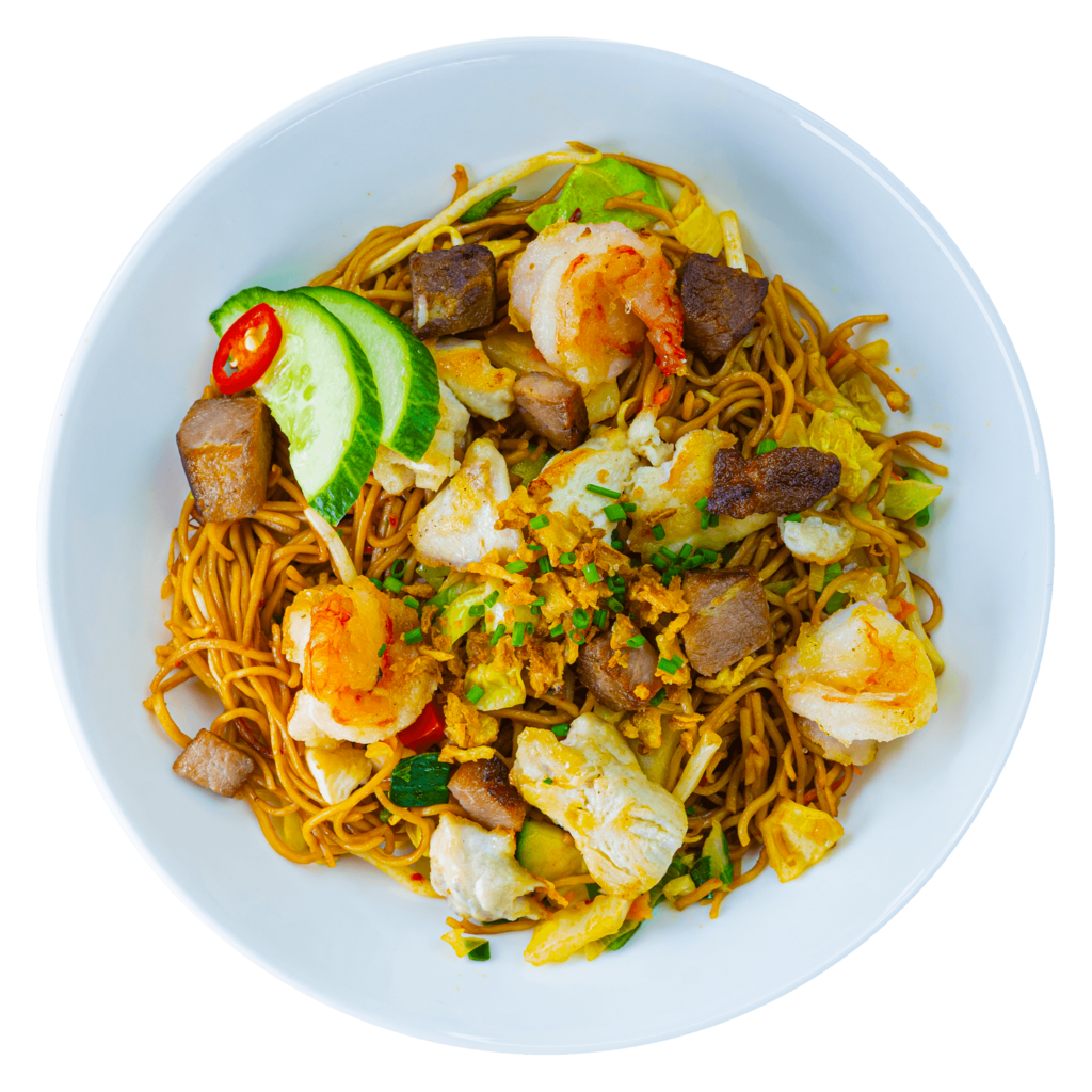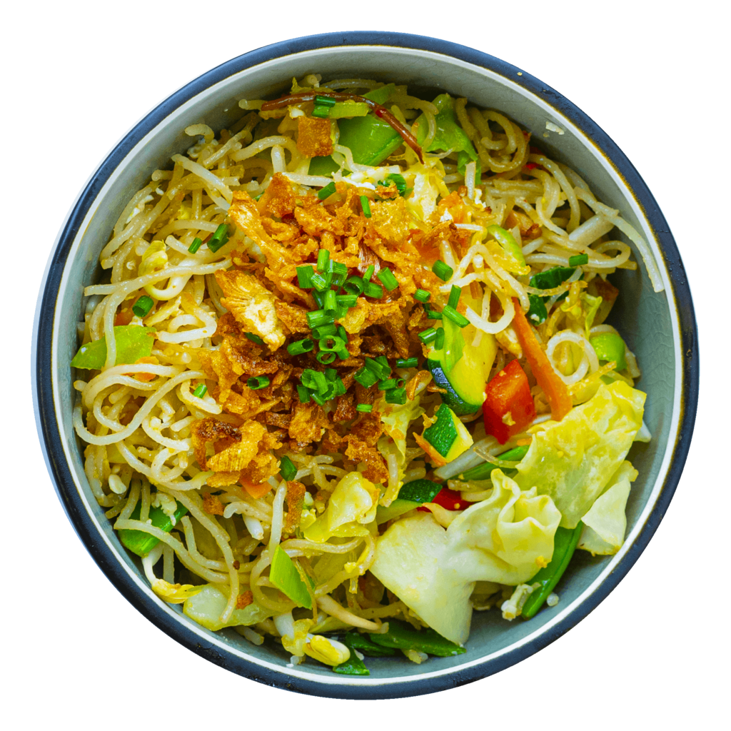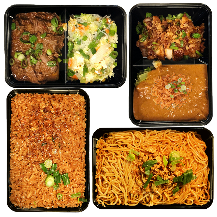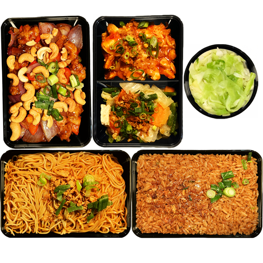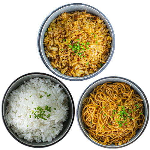 Kies uit: Nasi, Tjauwmin (dunne bami), Dikke bami (Javaans), Witte rijst (Thaise pandan), Nasi met groenten, Tjauwmin met groenten en meer.