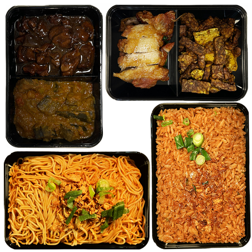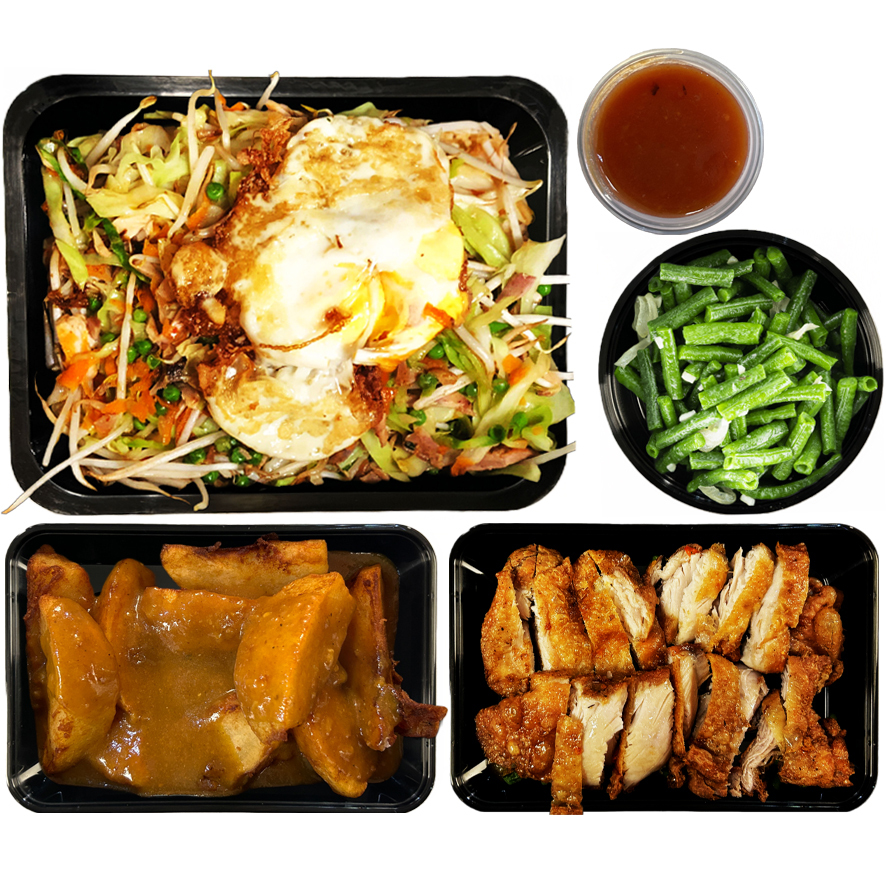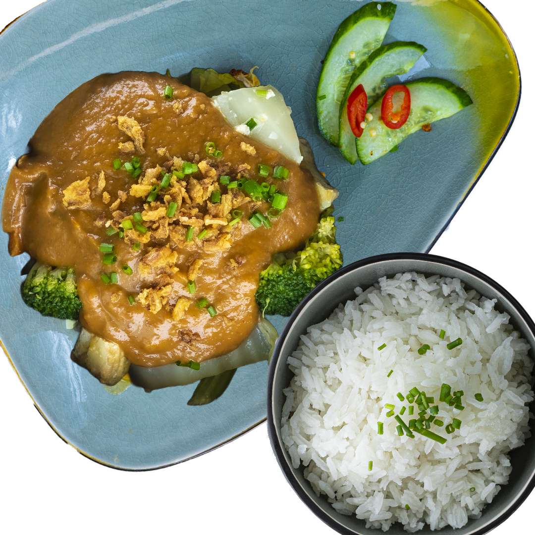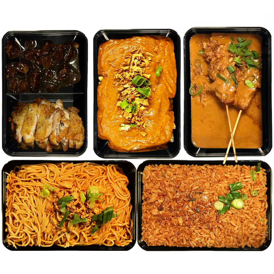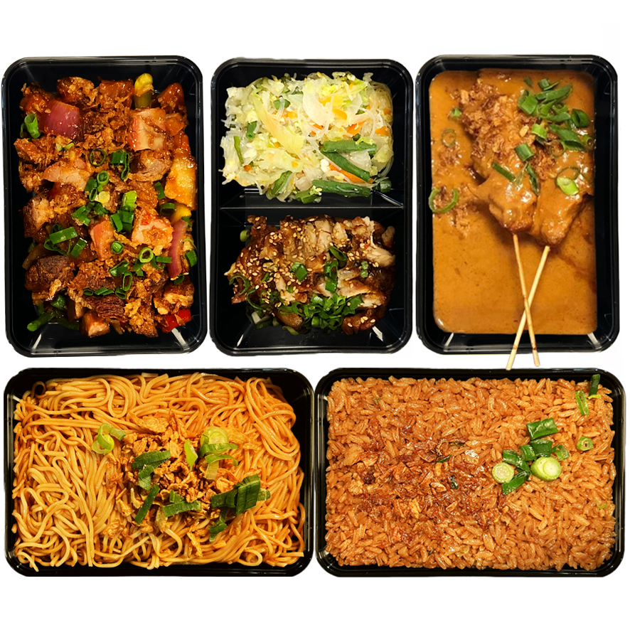 Kies uit: Nasi, Tjauwmin (dunne bami), Dikke bami (Javaanse), Witte rijst (Thaise pandan), Nasi/Bami met groenten, Batata (aardappelpartjes in jus) en meer.