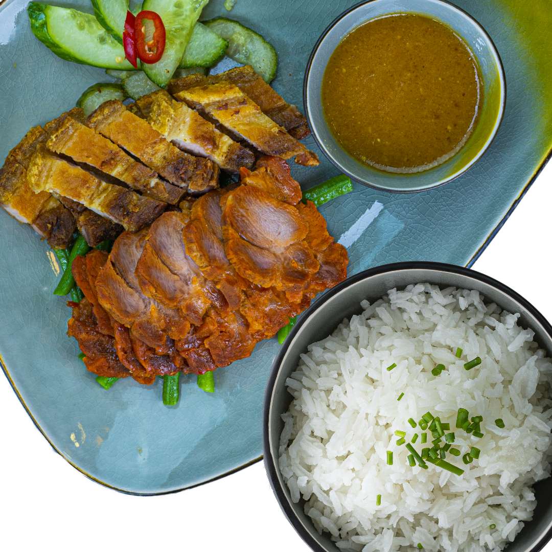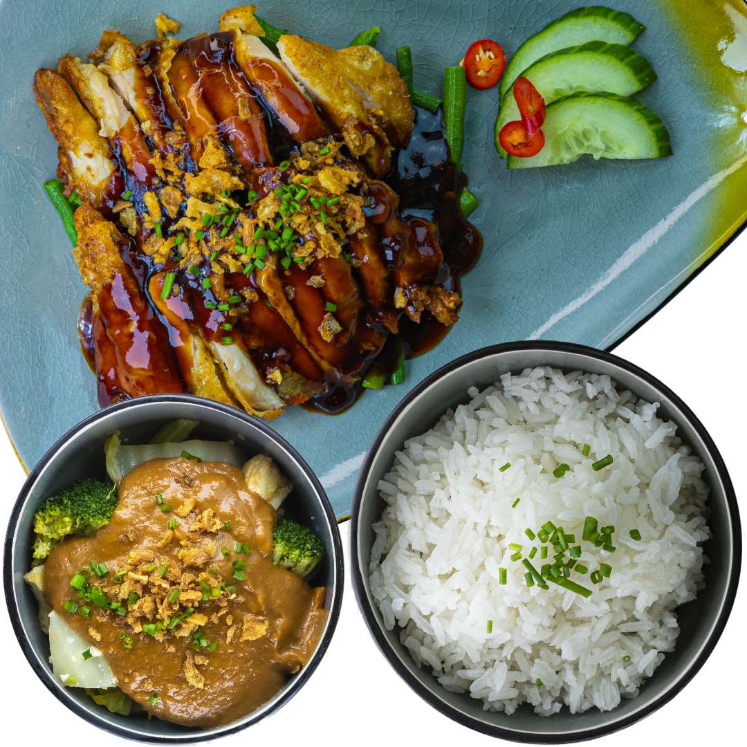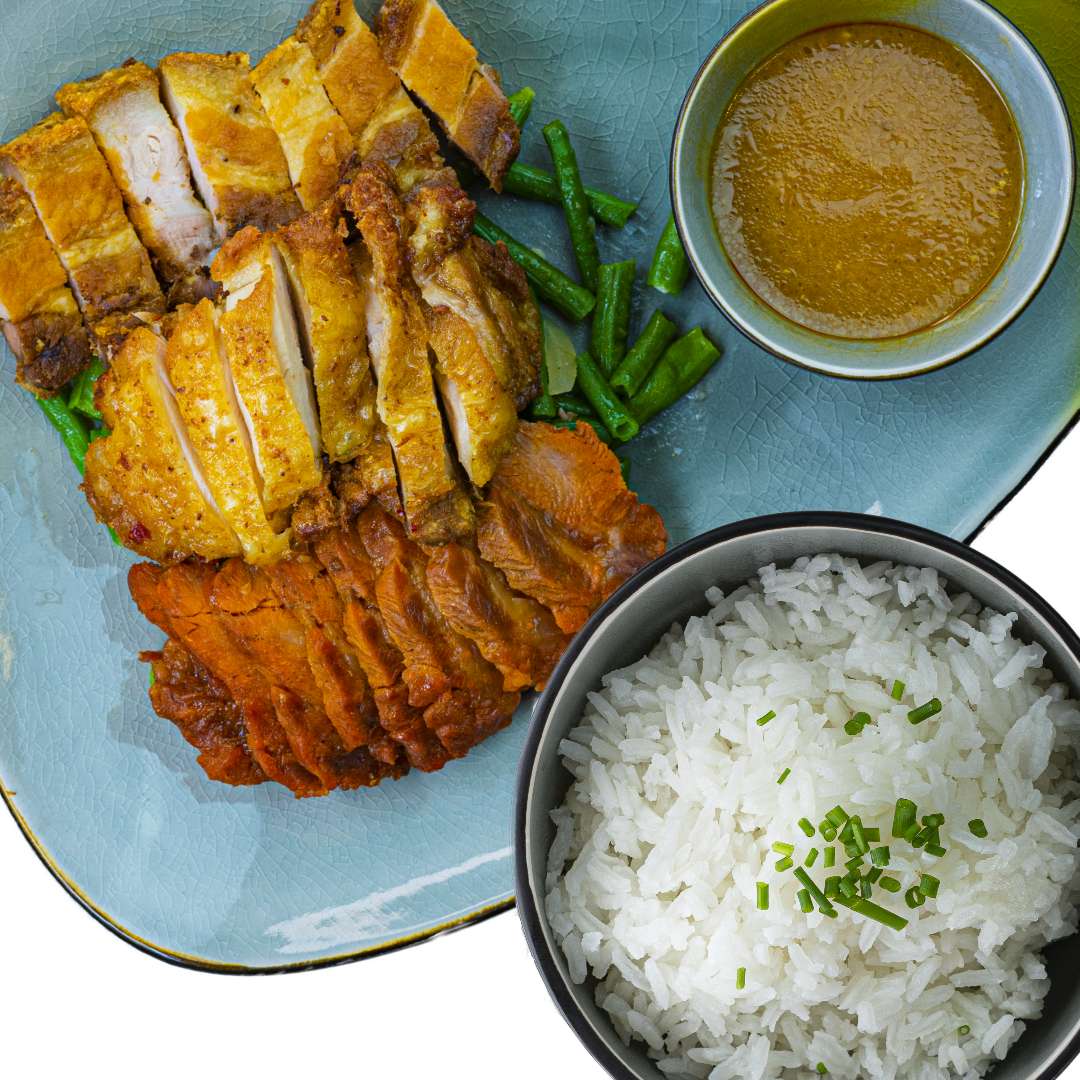 Mixed roast pork, teriyaki fried chicken, orak arik en 2 stokjes sate