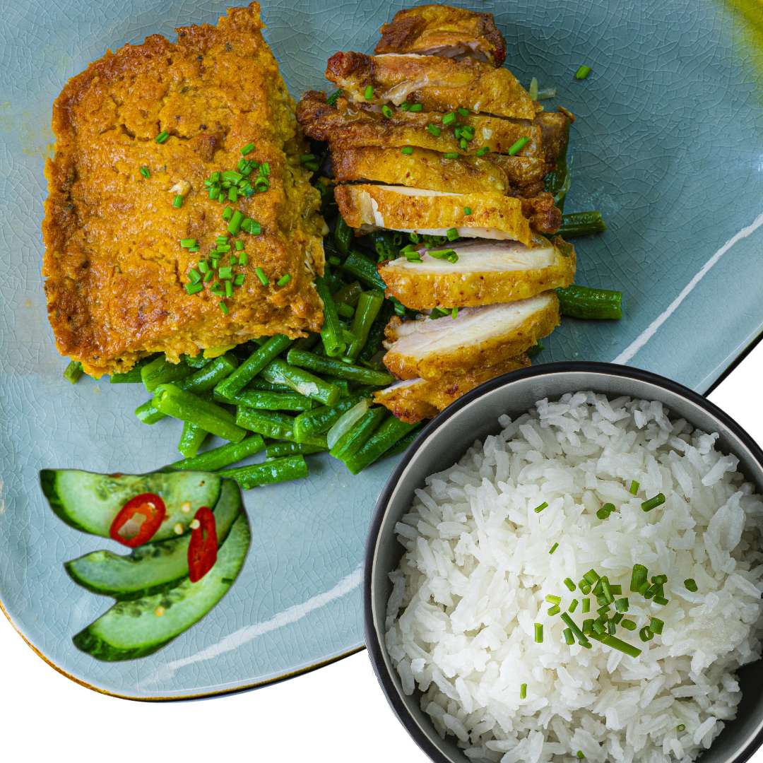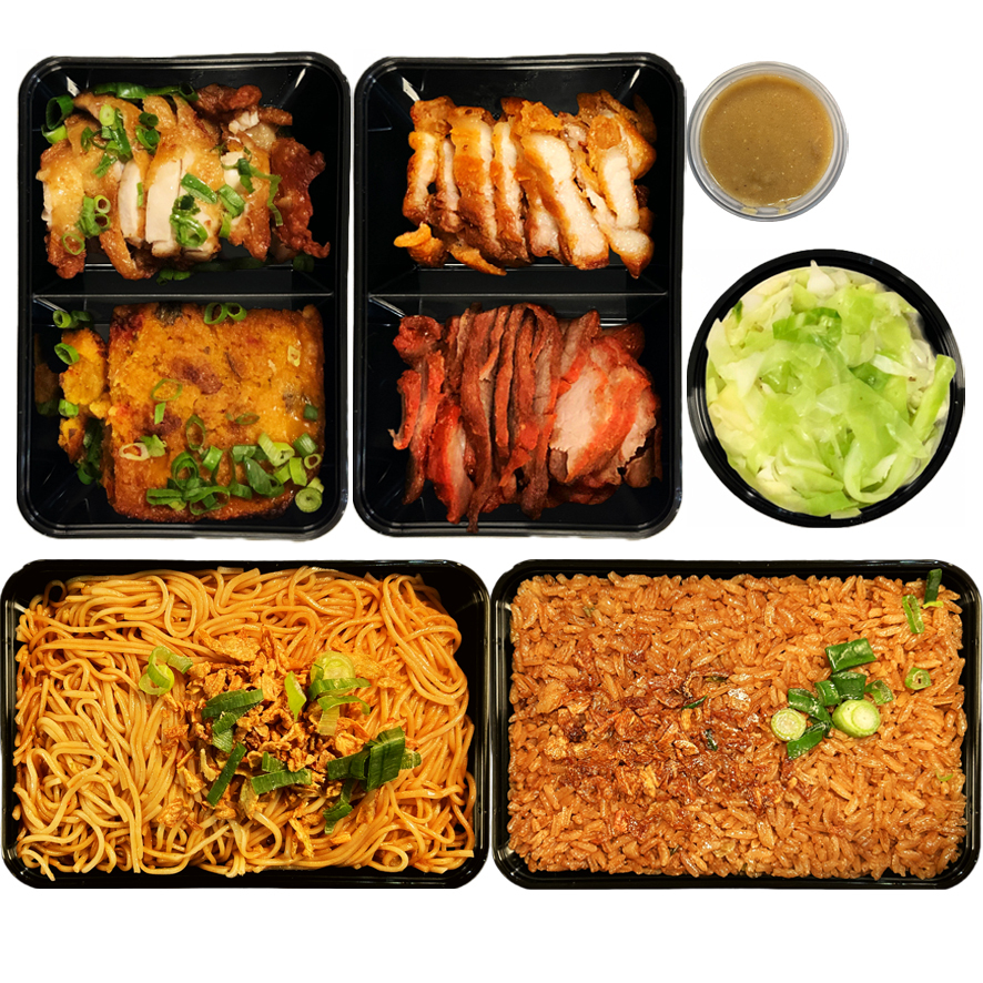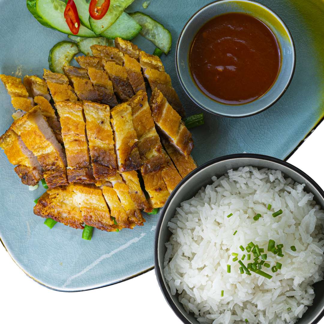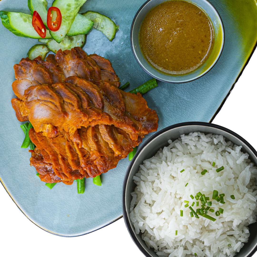 Mixed roast pork, teriyaki fried chicken, orak arik en 2 stokjes sate