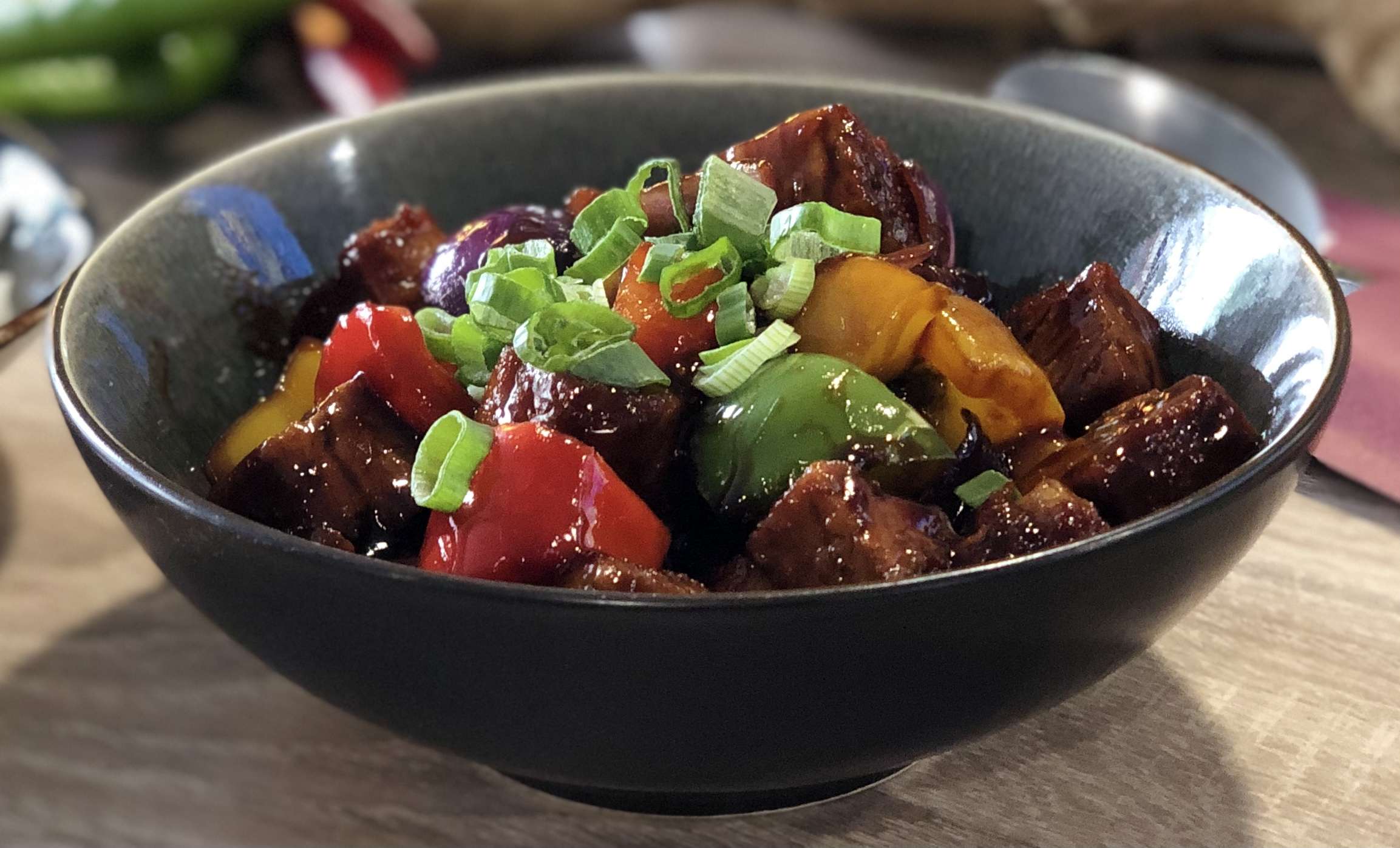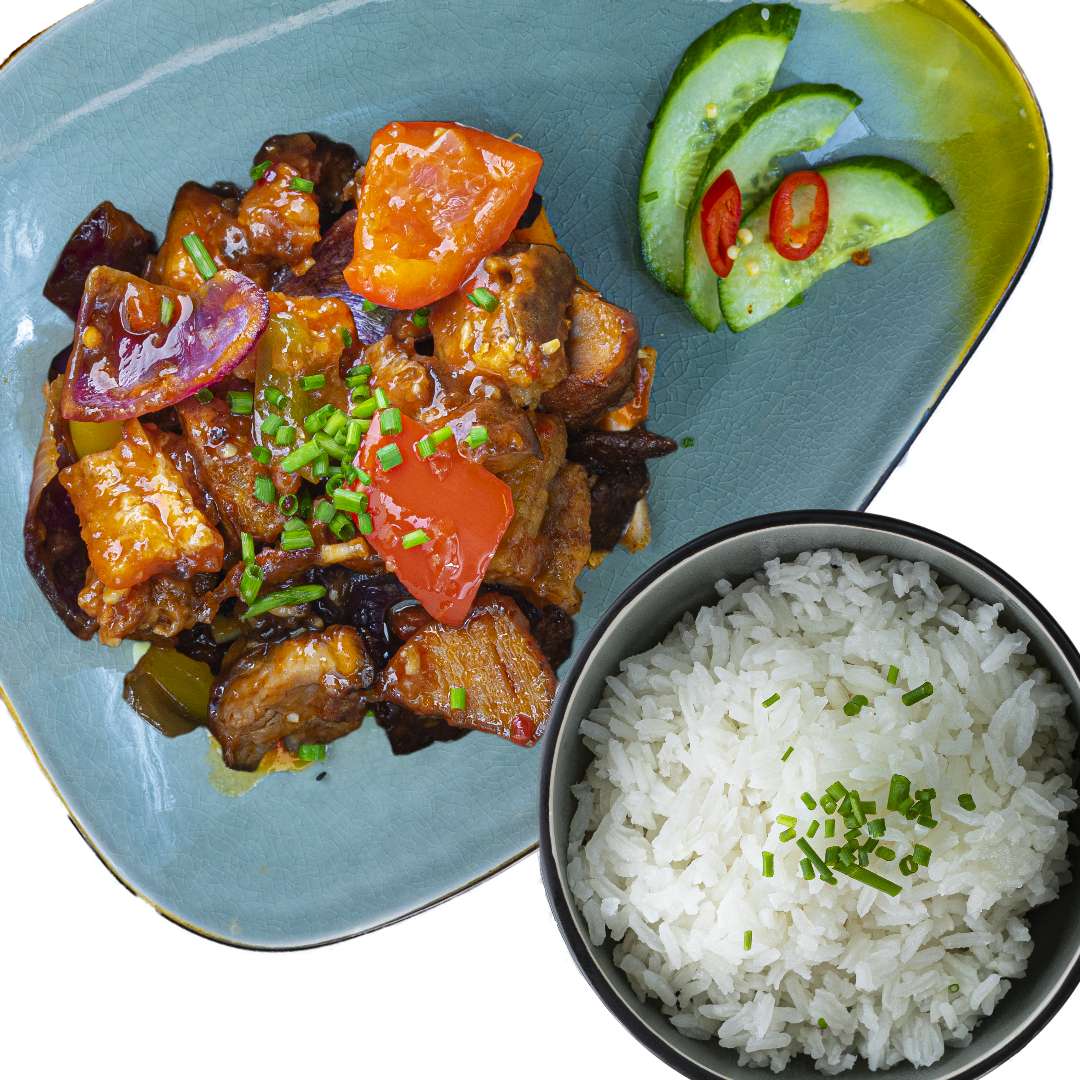 Surinaams-Chinees varkensvlees gerecht met zoet varkensvlees en geroosterde speklapjes