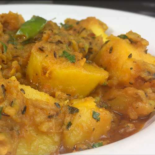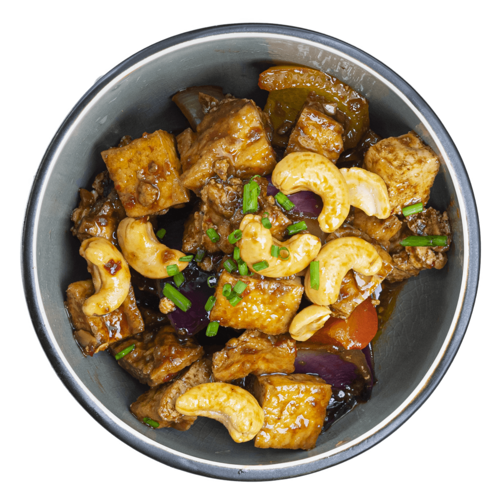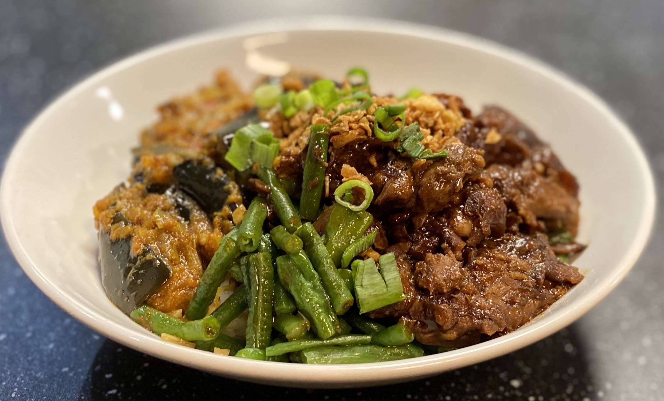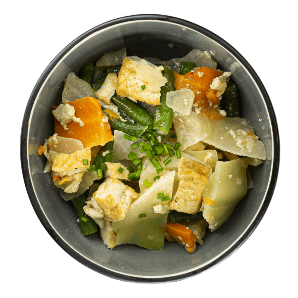 met aubergine, paksoy-spitskool en tahoe-tempeh in kerrie