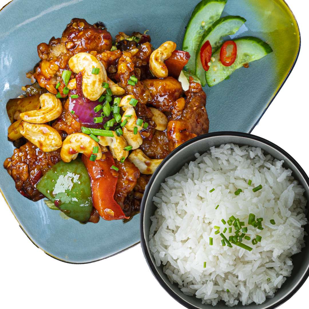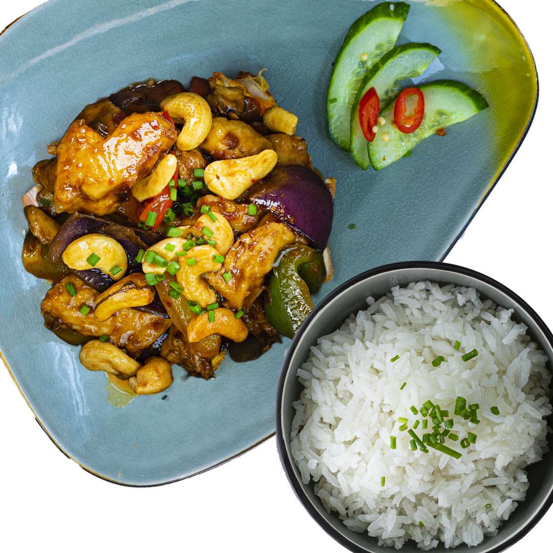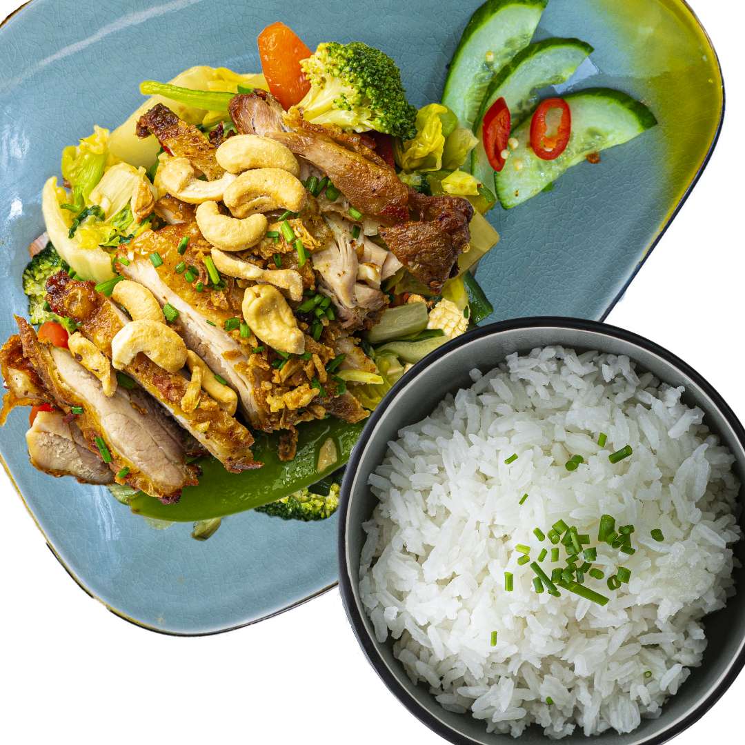 Krokante kip cashew, spitskool, sajoer lodeh en hete kip