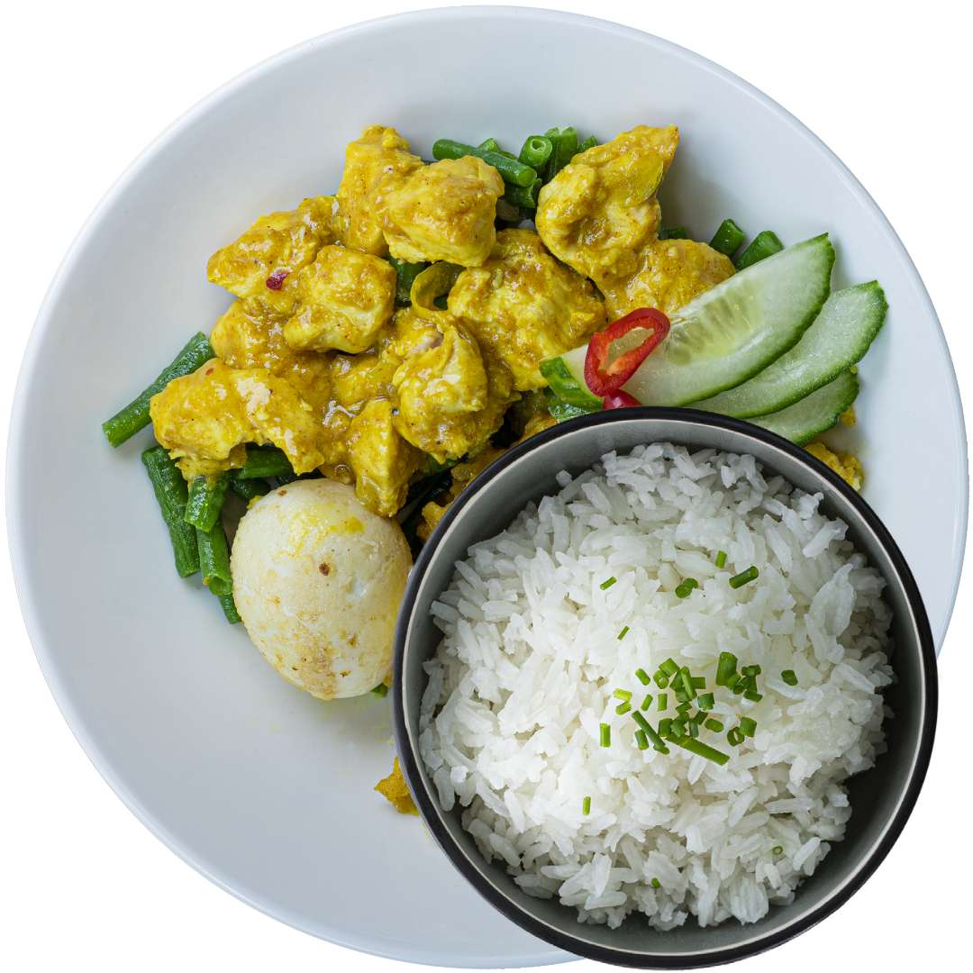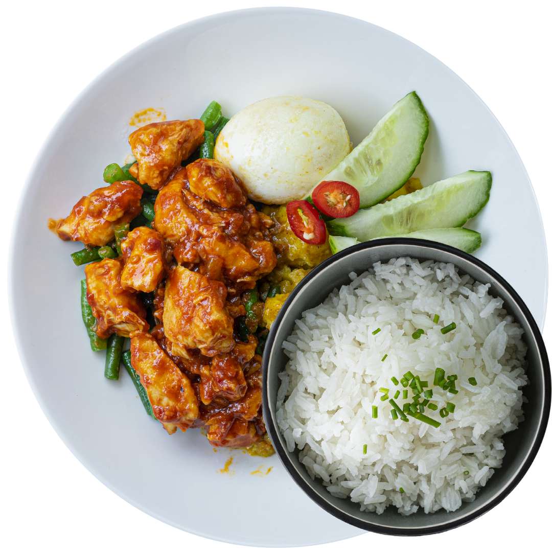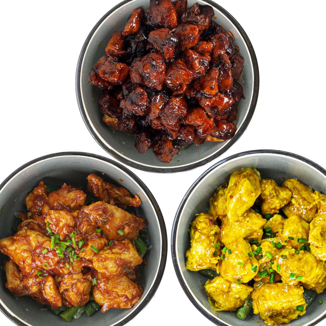 Kies uit: Kipkerrie, Hete kip, Ketjap kip (dijfilet), 250cc (klein rond bakje), 500cc, 1000cc