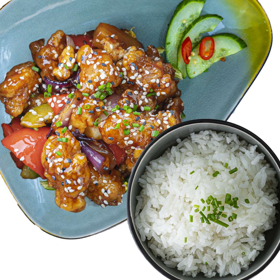 krokante kipfiletstukjes in zoetzure saus en paprika, ananas en ui