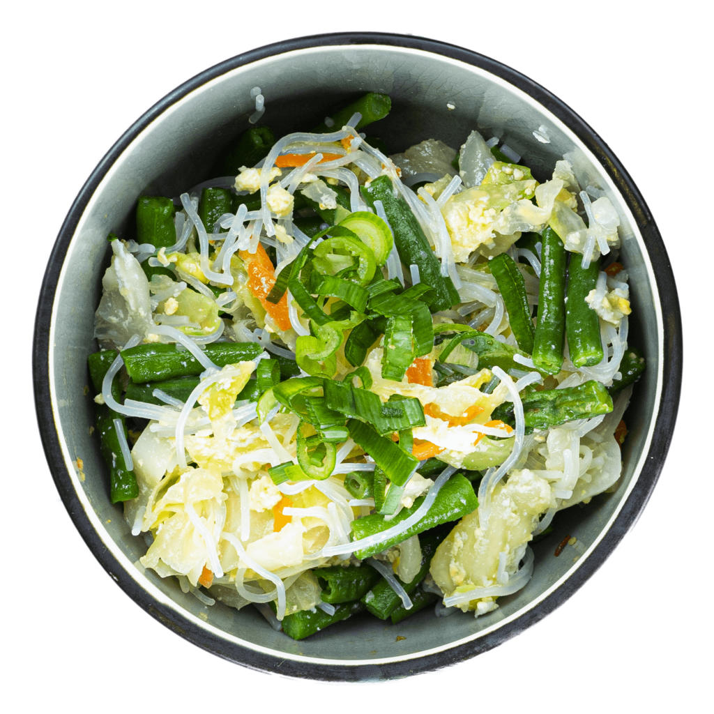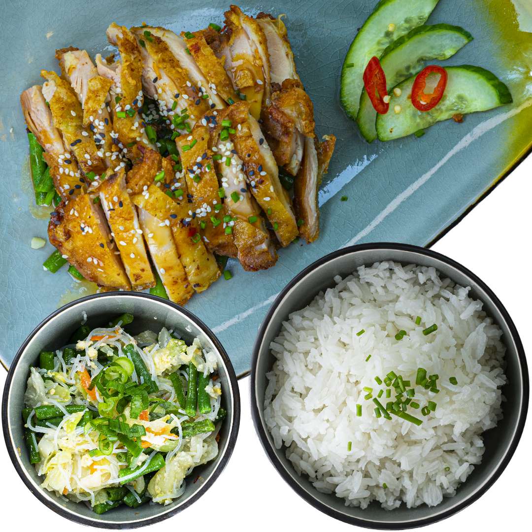 gegrilde kip teriyaki en Indisch groenten gerecht met vermicelli, spitskool en ei