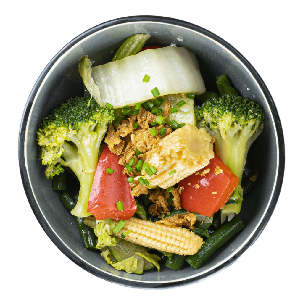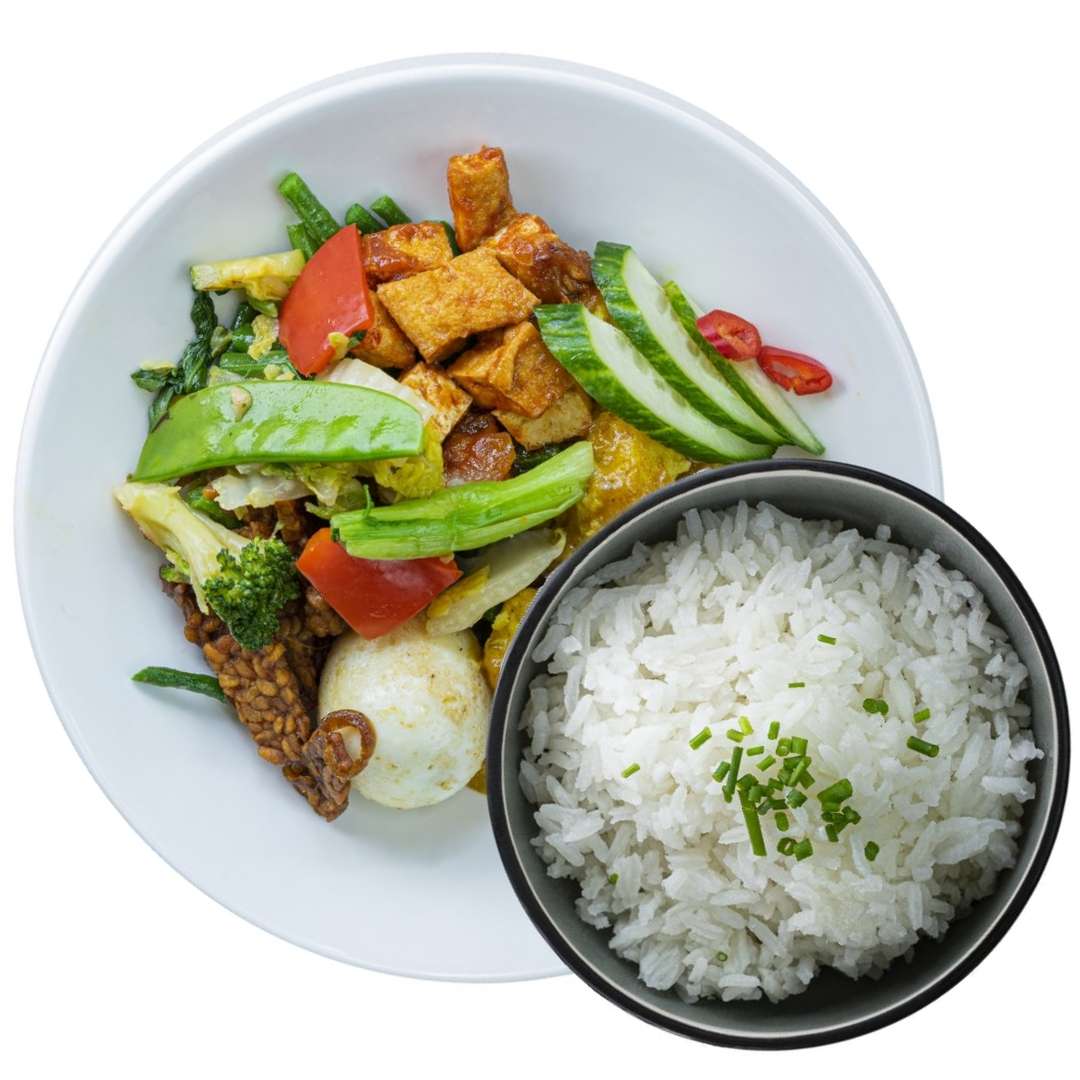 met gemengde groenten, tofu in zoetpikante saus en tempeh sambal goreng