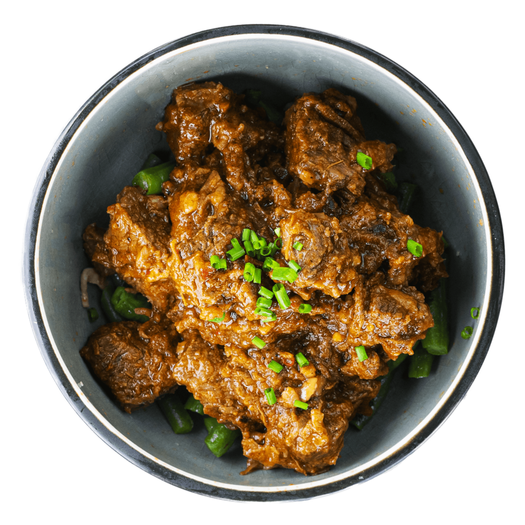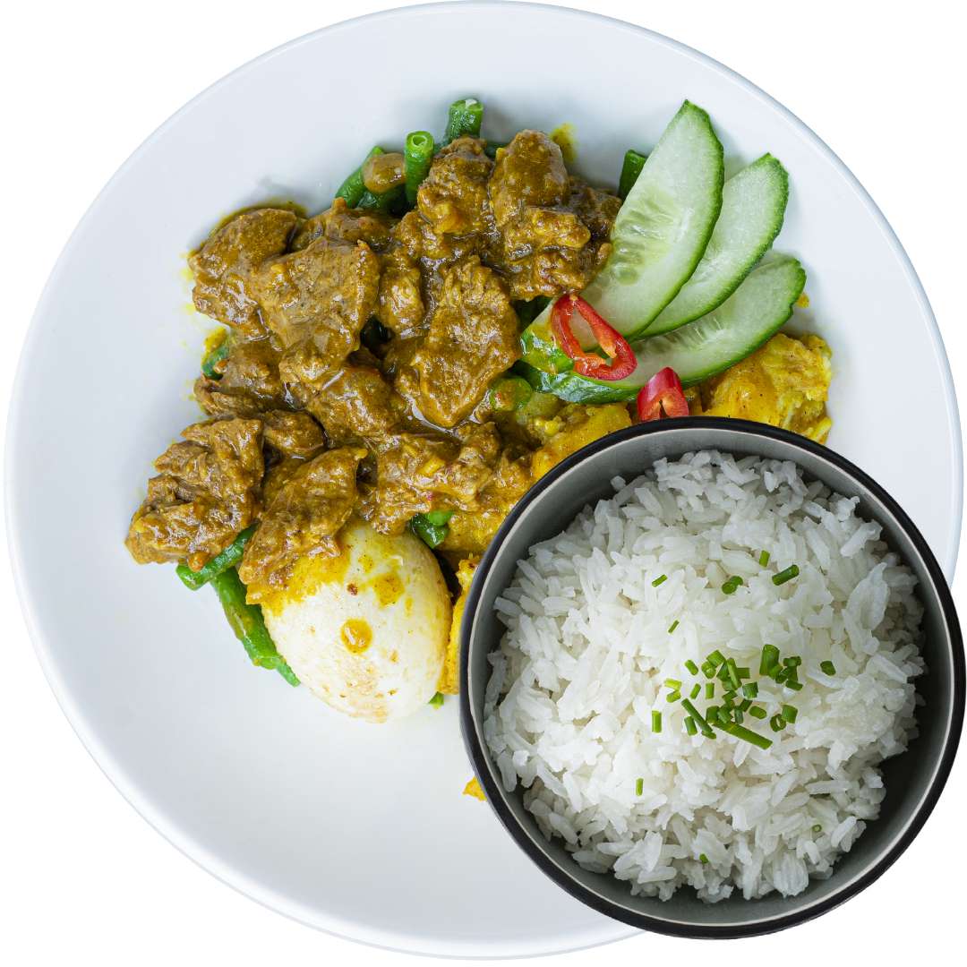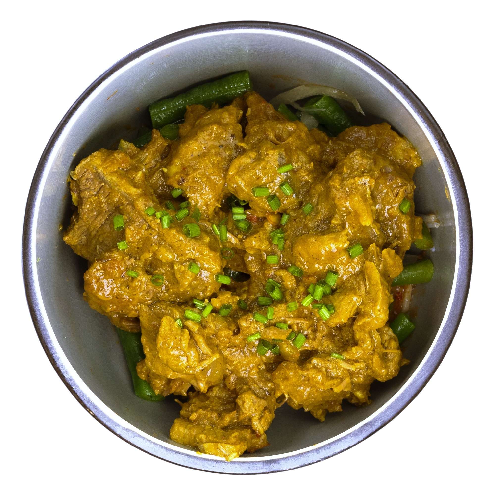 Surinaams gekruid lamsvlees met kousenband en kerrie ei