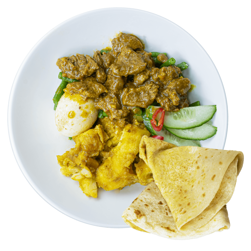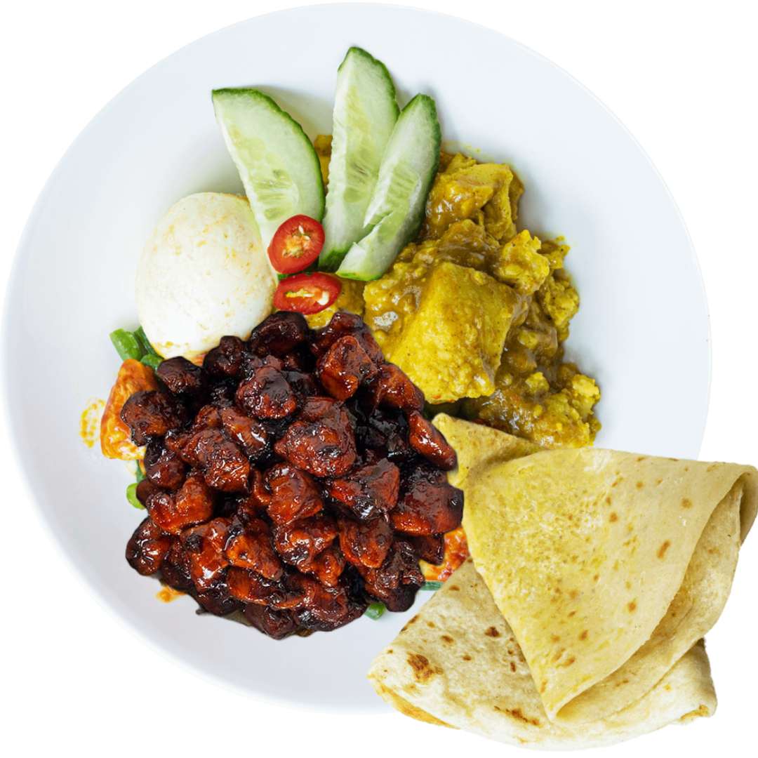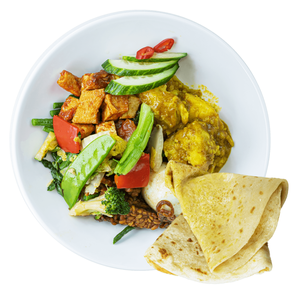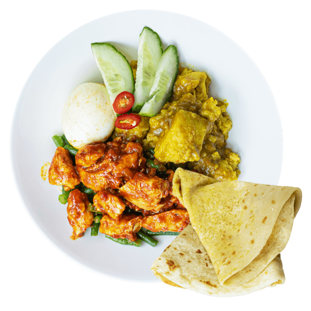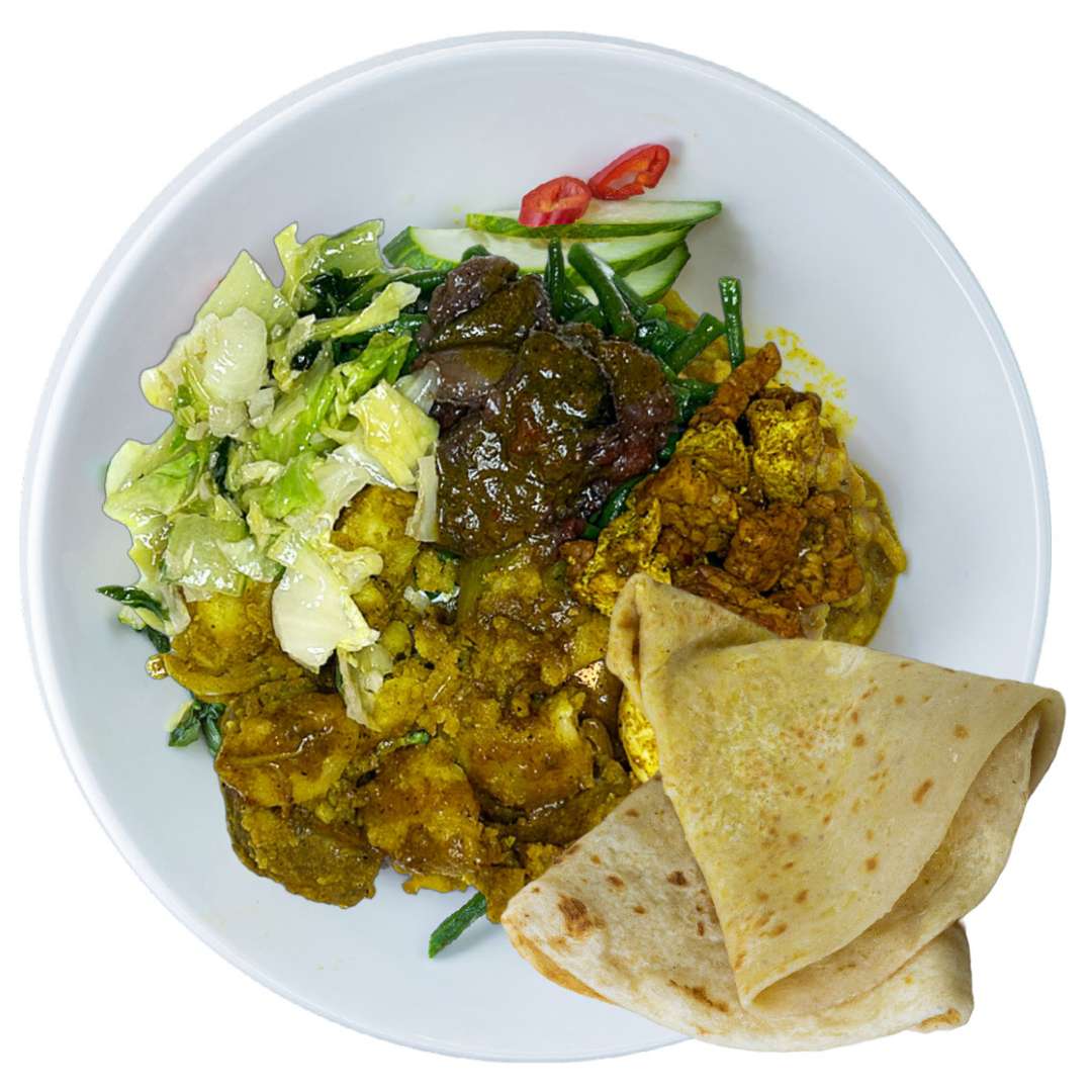 Kies uit: met rotiplaat (standaard-keuze), 250cc Witte rijst ipv roti-plaat (klein rond bakje), 250cc Nasi ipv roti-plaat (klein rond bakje), 250cc Tjauwmin ipv roti-plaat (klein rond bakje), 250cc Dikke bami ipv roti-plaat (klein rond bakje), geen zuur en meer.
