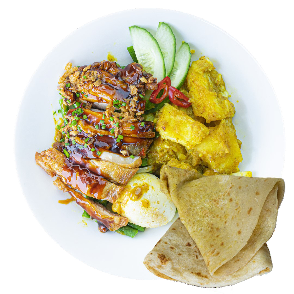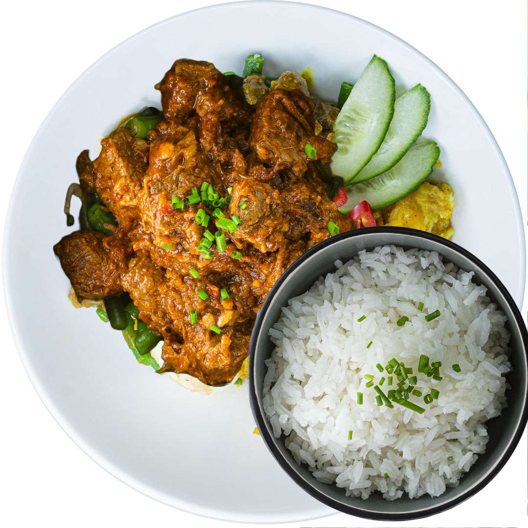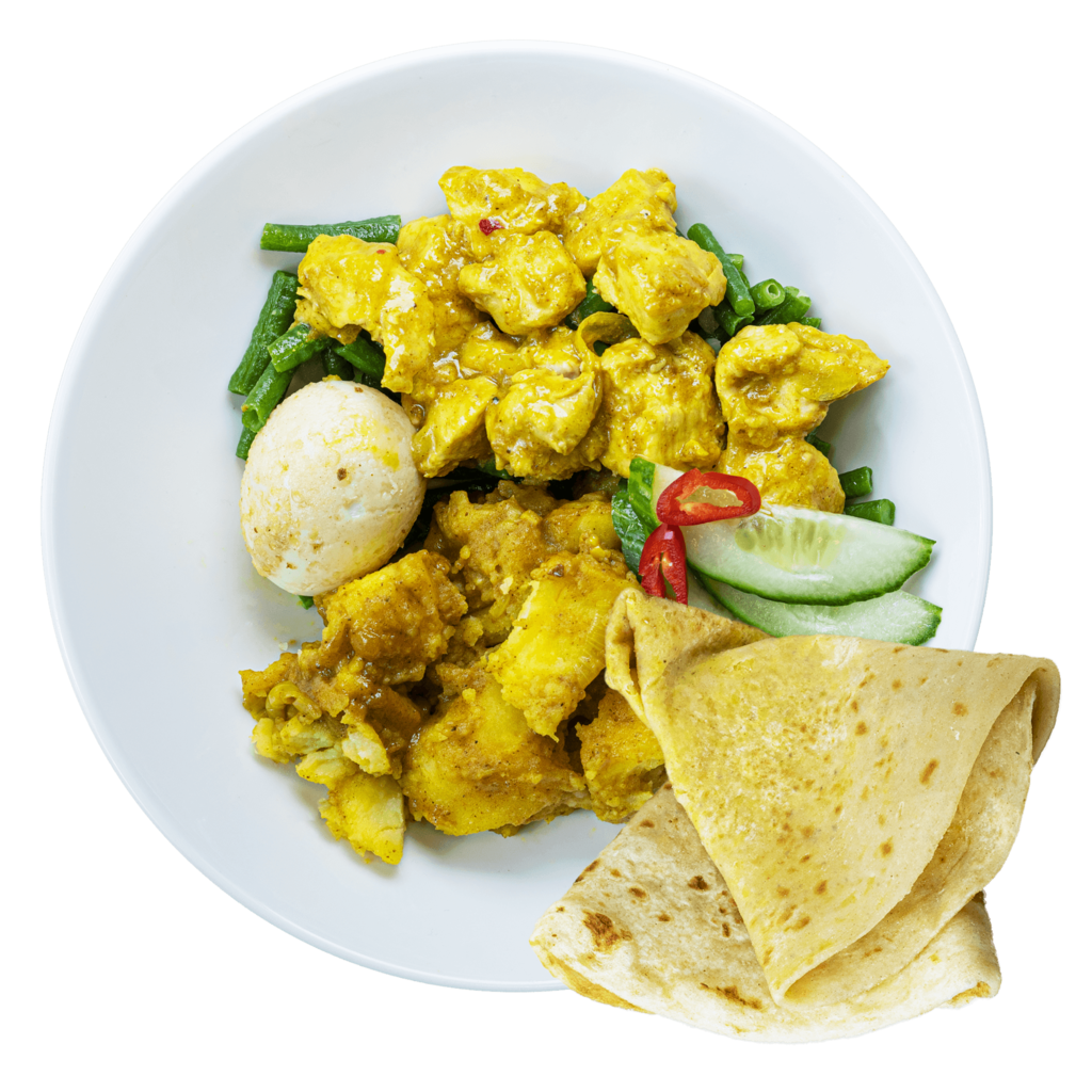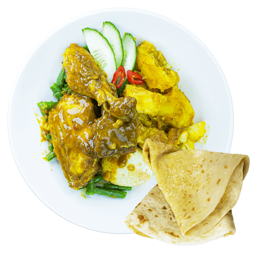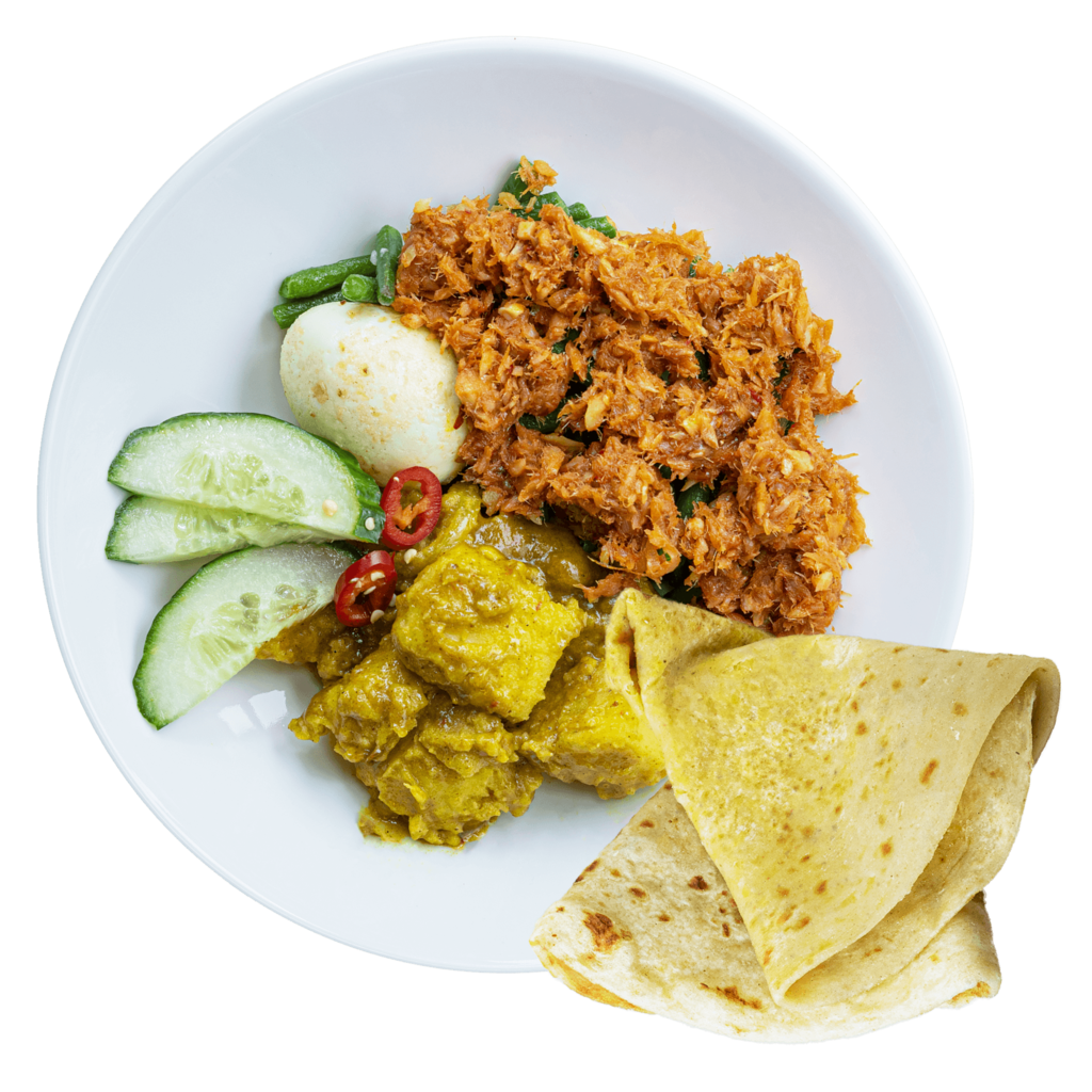 Kies uit: met rotiplaat (standaard-keuze), 250cc Witte rijst ipv roti-plaat (klein rond bakje), 250cc Nasi ipv roti-plaat (klein rond bakje), 250cc Tjauwmin ipv roti-plaat (klein rond bakje), 250cc Dikke bami ipv roti-plaat (klein rond bakje), geen zuur en meer.
