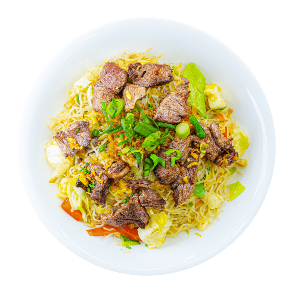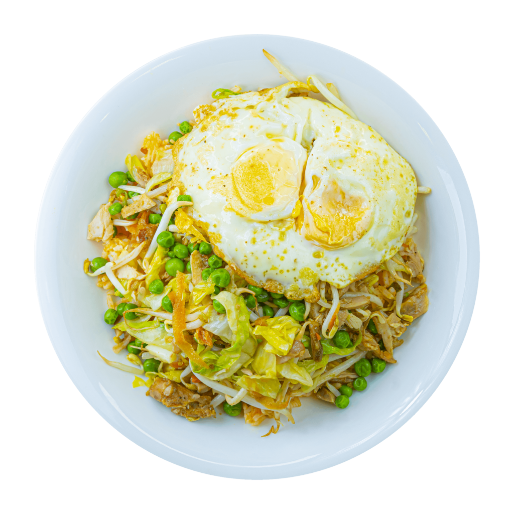 met geroerbakte tauge, kool, doperwtjes en reepjes kip en dubbele spiegelei erbovenop.