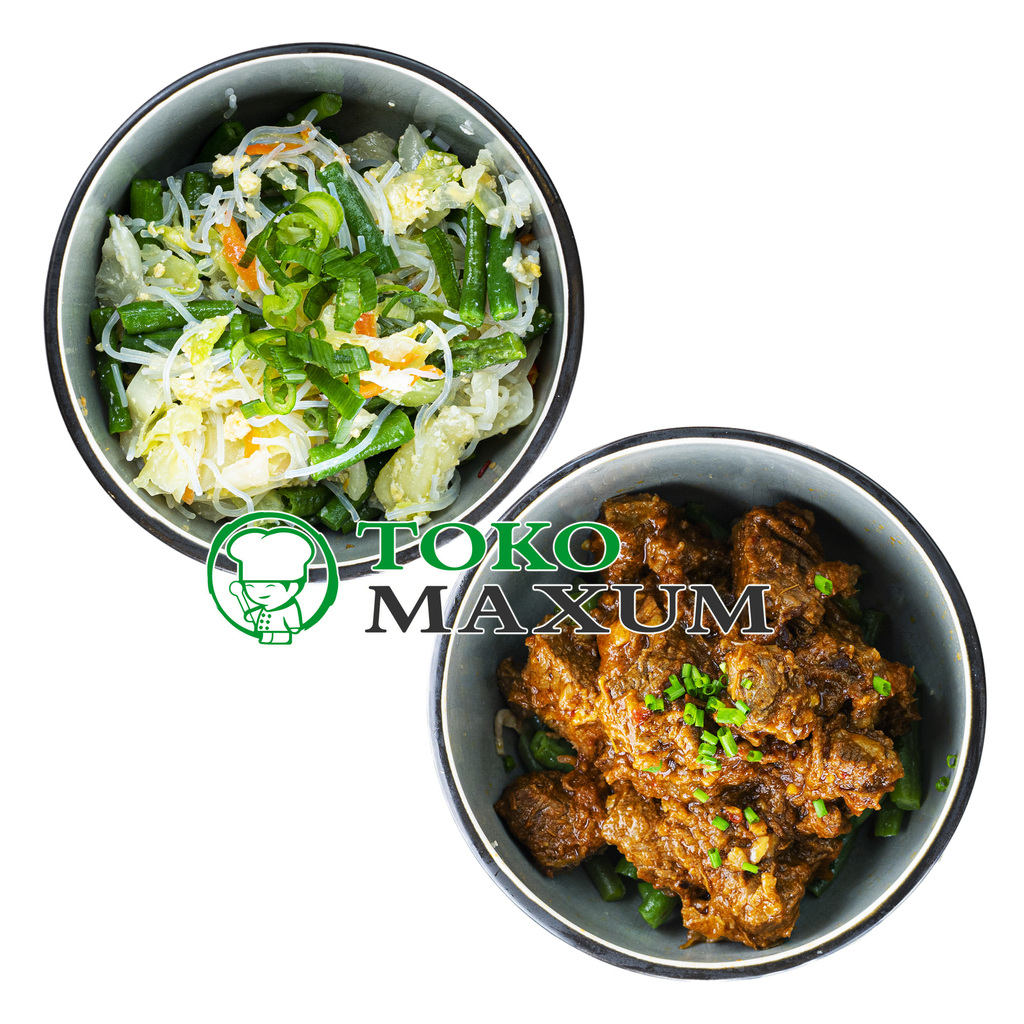 Kies uit: Normale portie (1 pers.), Grote portie (2 pers.), Nasi, Tjauwmin (dunne bami), Dikke bami (Javaanse), Witte rijst (Thaise pandan) en meer.