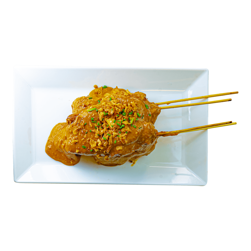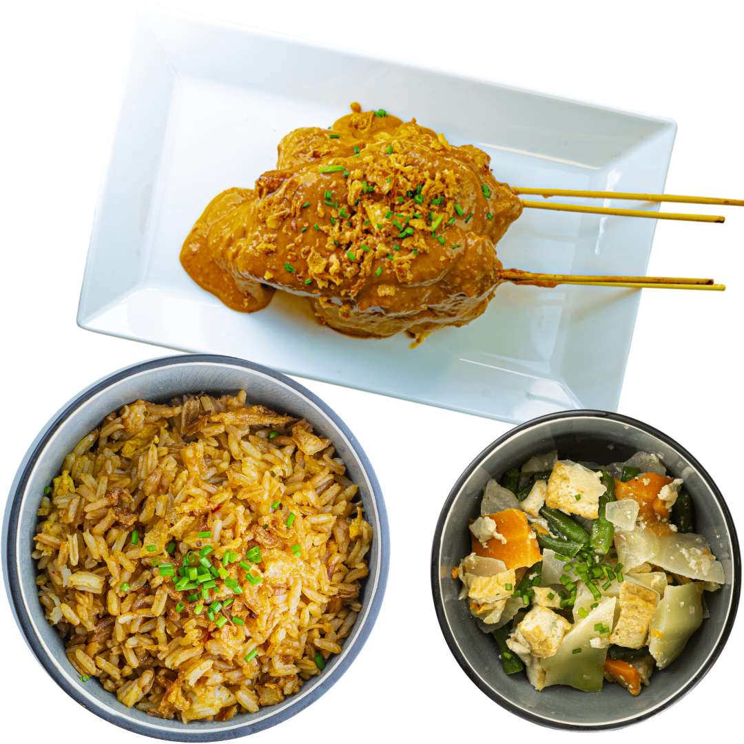 4 stokjes saté met bakje groenten naar keus en nasi, bami of rijst