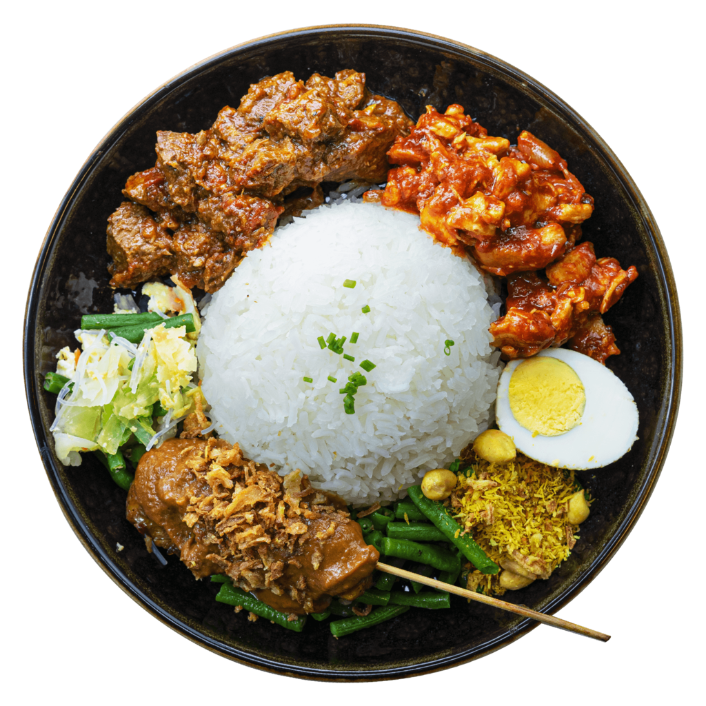 Kies uit: Nasi, Bami, Geen pika, Pika, geen zuur, cupje komkommerzuur en meer.
