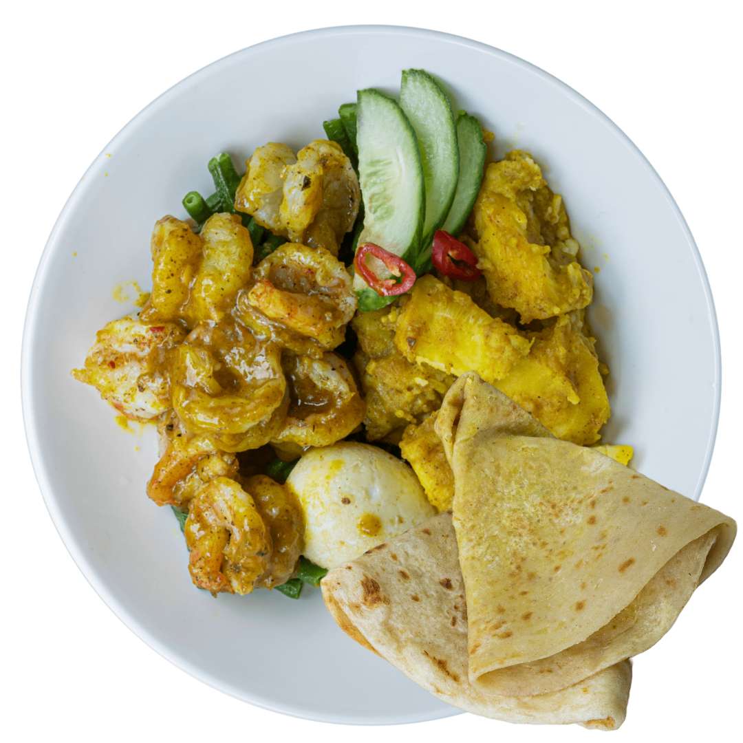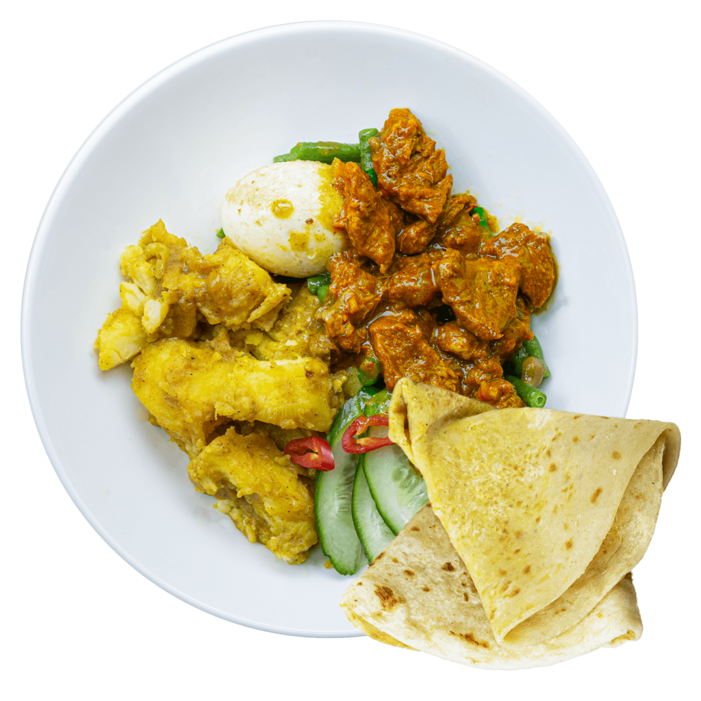 Standaard geserveerd met roti-pannenkoek, maar kan ook met klein bakje nasi, bami of rijst eventueel