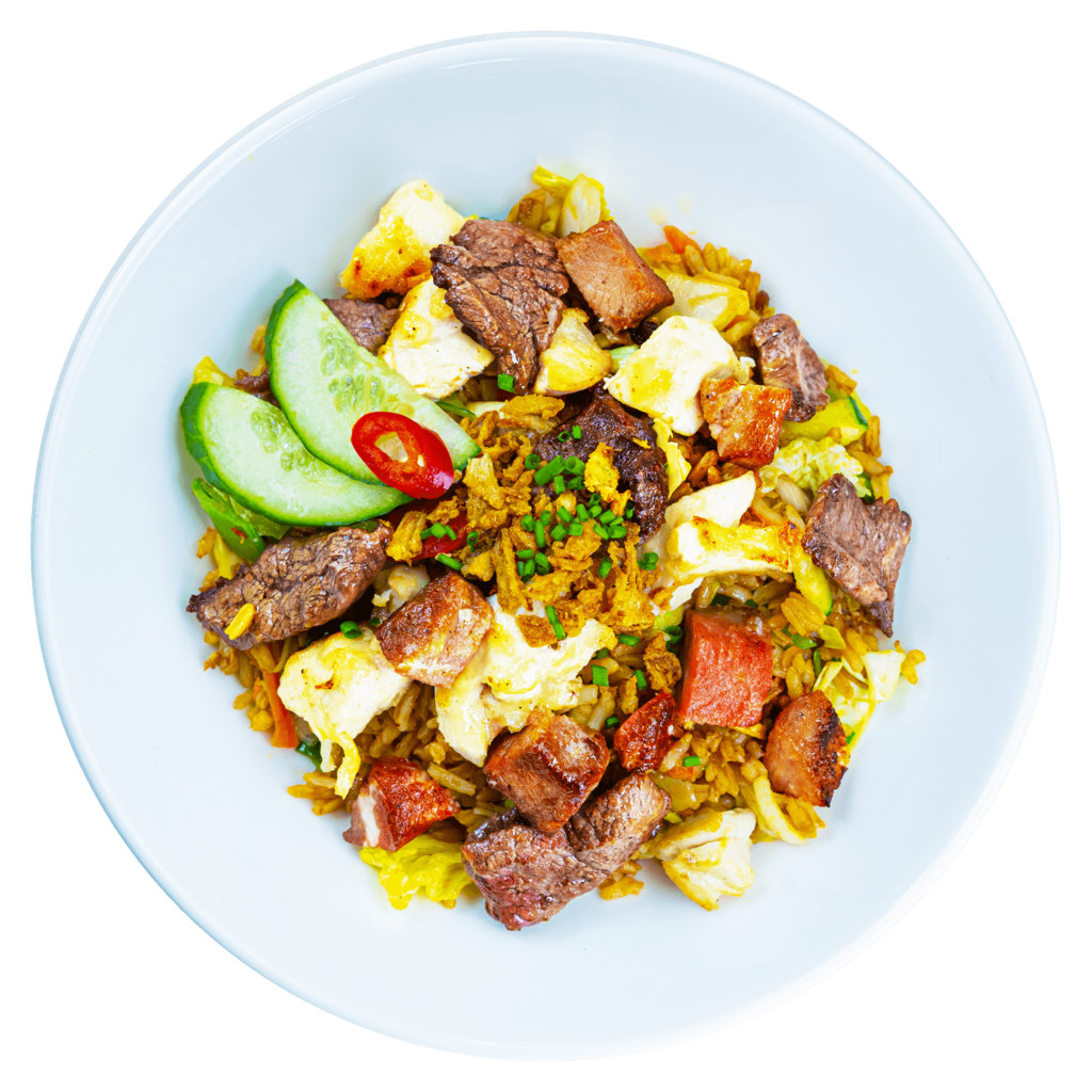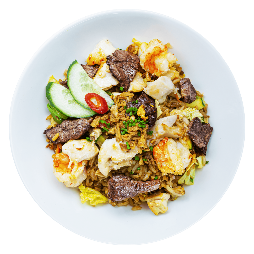 geroerbakt met groenten en kipblokjes, garnalen en runderhaas erbovenop