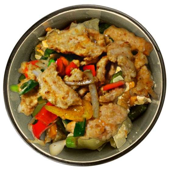 geroerbakt met groenten, kipblokjes, varkensvlees en runderhaas