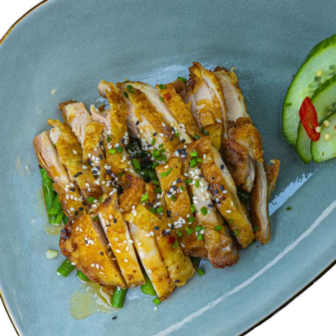 Kippedijfilet in ketjapsaus met kousenband en ei.